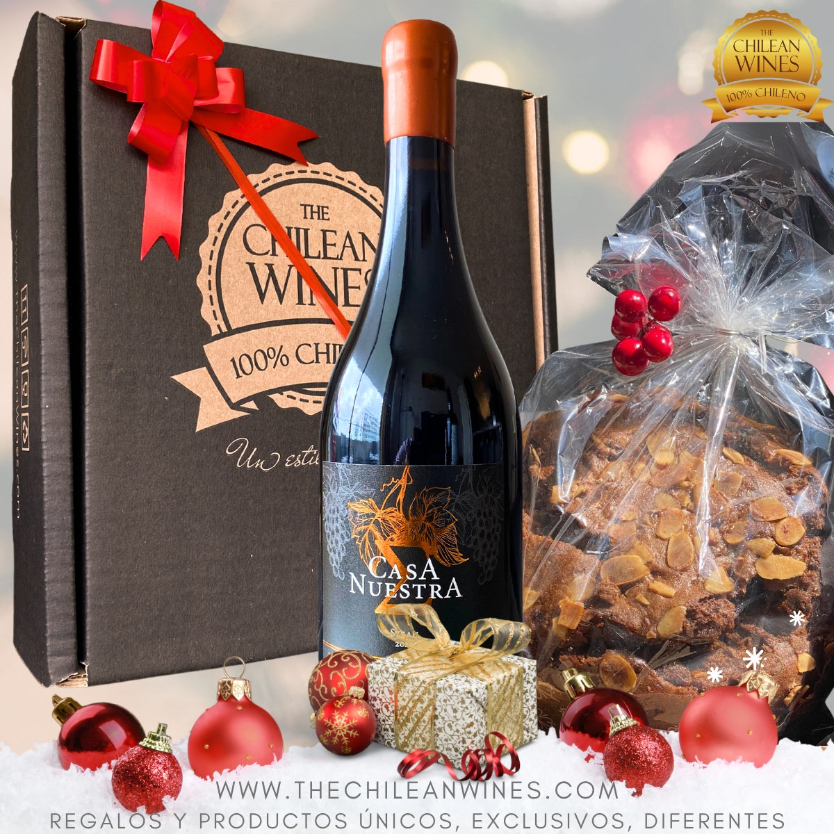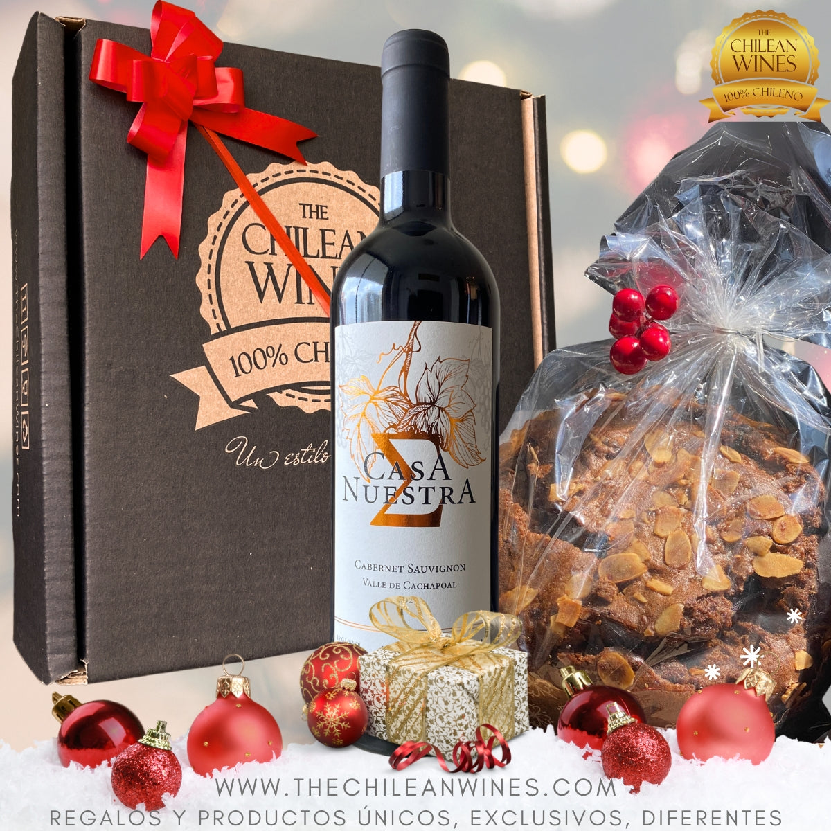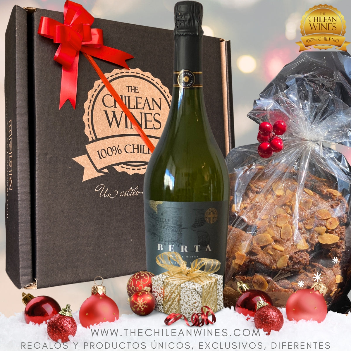 🎄¿ESPUMANTE O VINO?🎁 Caja Navideña ChileanWines con Espumante o Vino + Pan de Pascua frutos secos + Caja Estuche Premium + Cinta de Regalo