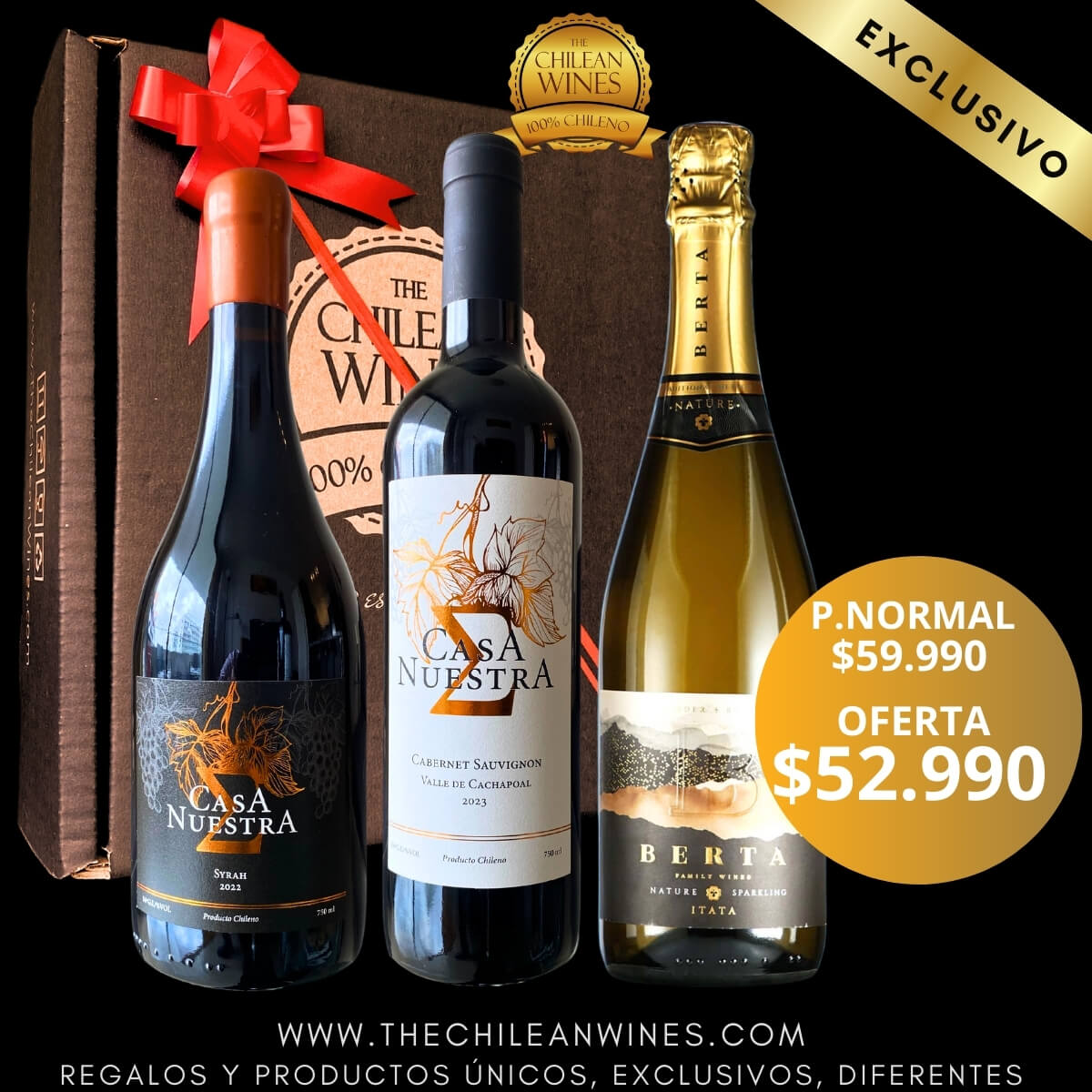 ¡Tripack Exclusivo! Vinos Boutique Casa Nuestra + Espumante Premium + Caja Estuche Regalo + Cinta de Regalo